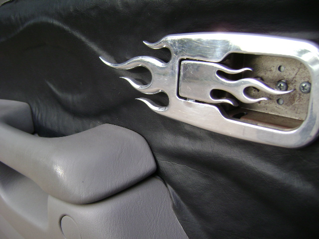 flame billet mirror, door handles, billet window cranks, custom bully dog flame pedals, and blue led guages including blue hvac controls