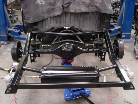 Firestone 2600 big bags, custom front bag mount, modified 3/16” plated frame, modified radius arms, DJM upper arms, ½” 350 psi valves, ½” fittings, Reverse bushing modified 4-link, boxed and super notched, custom shock and bag bridge, two firestone 9210 compressors, two Firestone 5 gal. ½” port tanks, custom tuck-up rack, port Doetsch Tech shocks, custom mounts for relocated fuse box and evap canister, Battery & gas tanks relocated to bed, extended wire harness, front wheel wells cut and beaded, cut and tubbed firewall to fit 19’s, Alston tubs, custom hinged bed cover, KP Playstation controller (air)