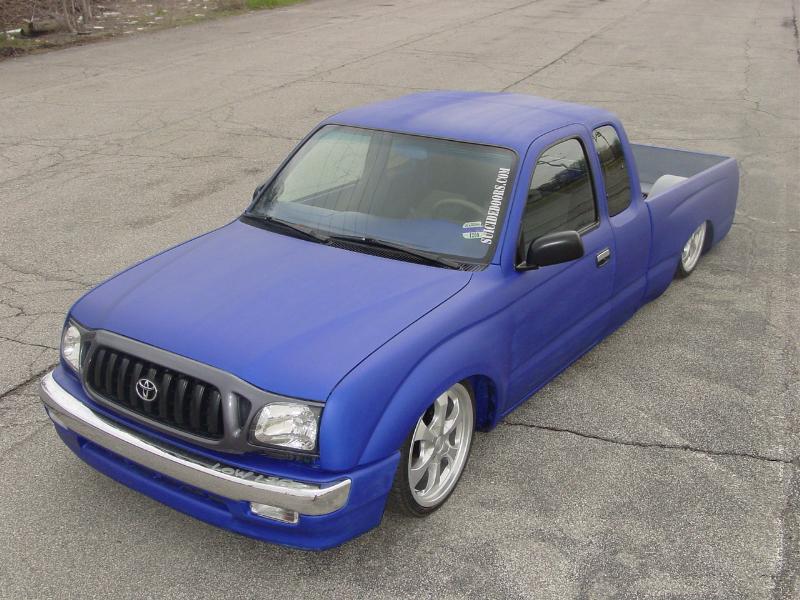 01 front end, lexan rear window w/ license plate, shaved atenna, corner lights, gas door, one piece tailgate/roll pan, so thats a shaved tail gate. red/clear tails. sheet metal bed with custom battery and air tank holder........ hot rod flatz daytona blue paint for now....