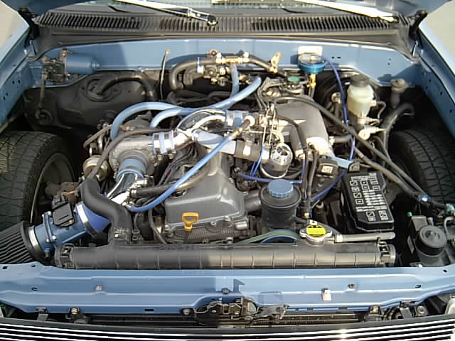 2.4L 4-banger with an E.L. turbo and flowmaster exhaust. Lightened stock flywheel, LC Engneering clutch, short shifter, adjustable timing gear, and flex fan. HKS blow off valve and soon to be installed intercooler. EGR mod, some painted stuff and a powder coated valve cover.