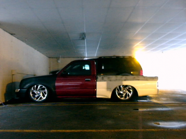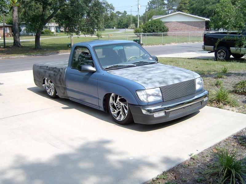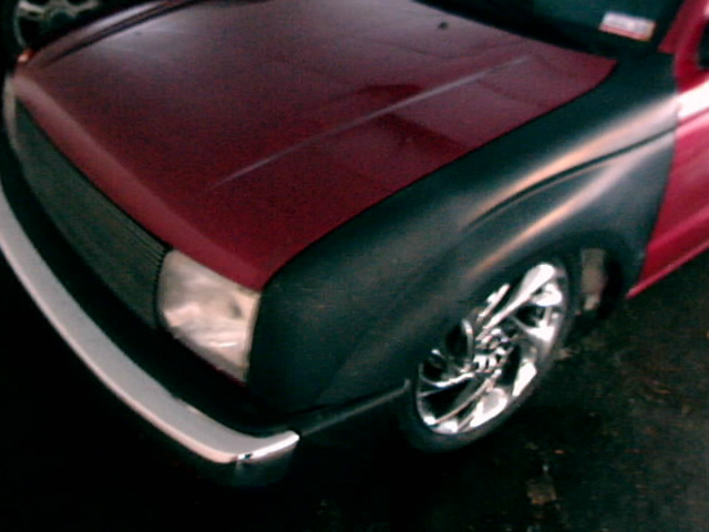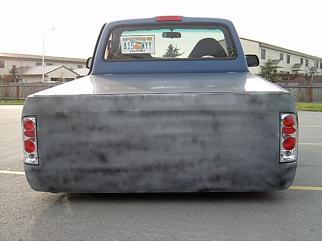 Shaved door handles, hood squirters, antenna hole, gas door. Tailgate skin and rollpan combo. Also a one off aluminum tonneau cover by Elite Concepts in Ft. Walton beach Fl. and custom wheel tubs in the rear. Euro tails, clears in the front bumper and a Lexan rear window with a plate box and lighted billet frame. Chrome windshield wipers and door strikers. Primered blue.