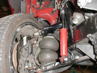 Firestone 2500's front 2600's rear with a four link, big ol' step notch, raised rack and pinion, relocated front shocks on the strut rods, lengthened upper control arms plus custom upper control arm/bag mounts. Custom fuel cell that resides where the spare tire used to call home to make room for the 4-link. Electric valves, two compressors, and air dryer all behind the seat. One 5 gallon tank. All plumbed with 3/8 line. Gonna try to get the front crossmember to lay this summer. It sits about 1/2" off the ground right now and it bugs the hell outta me!