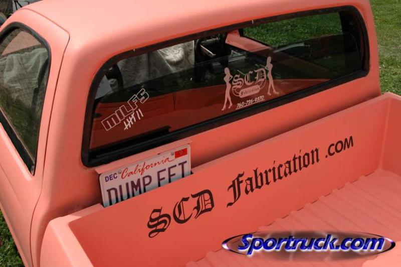 removed emblems, roll pan, tailgate shaved, stock floor body drop. shaved gas door. 2.5 inch chop top. electric roll down back window and license plate.