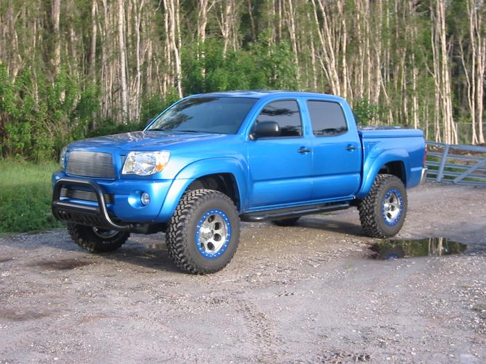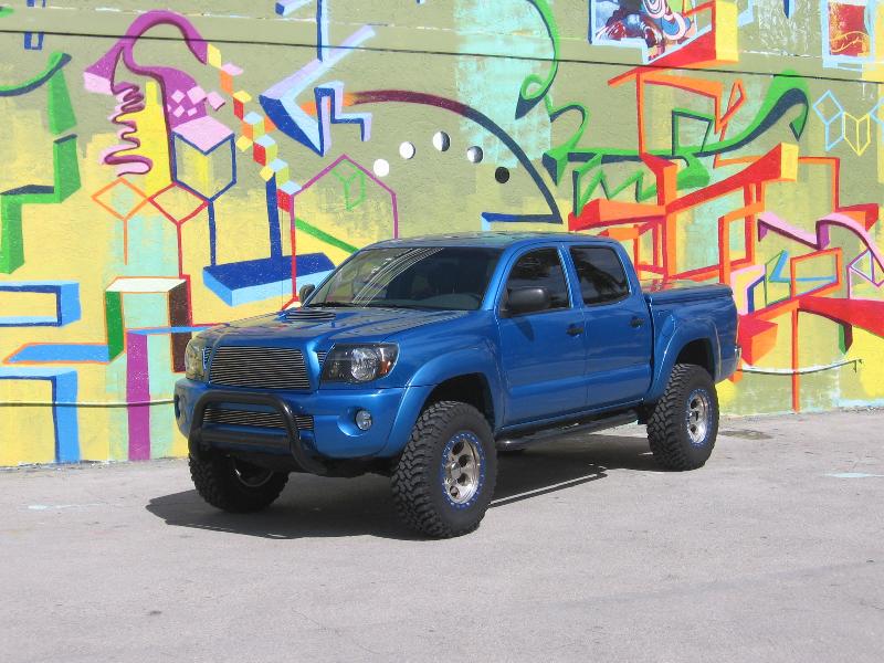 Westin front bull bar and side steps, T-rex billet grilles, replaced the chrome grille with a blue one, ARE LSII tonneau, black headlight mod, TRD scooped hood