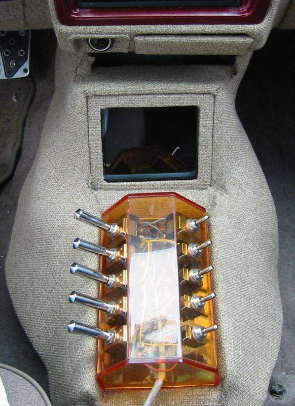 costom built fiberglass center console which houses a tv and a switch box holder thanks to my bud KEN DOGG, billet rear view mirror,white face gauge temperature plate,