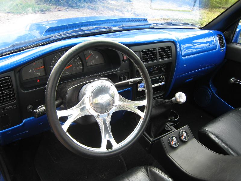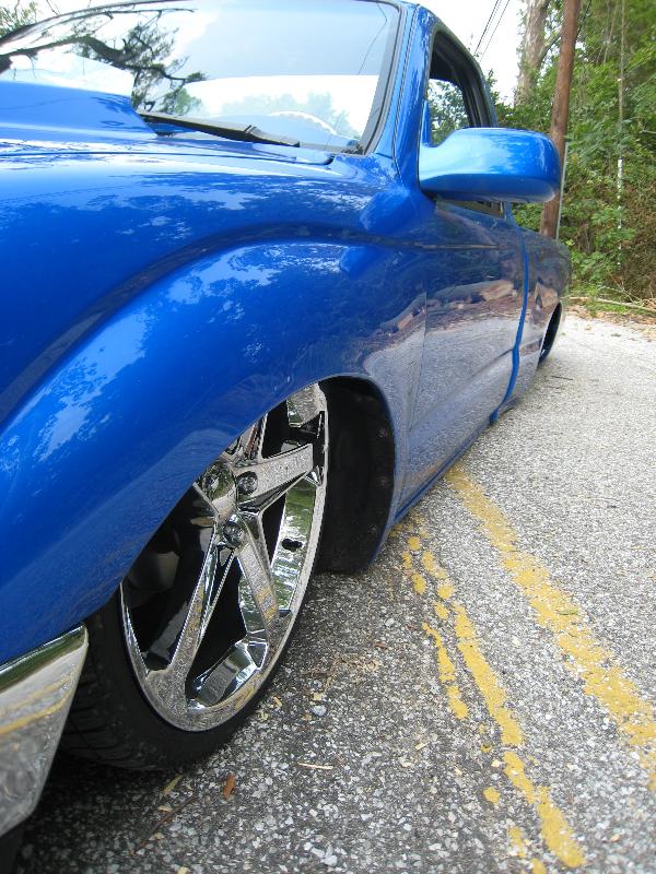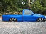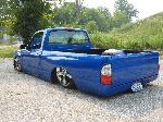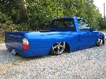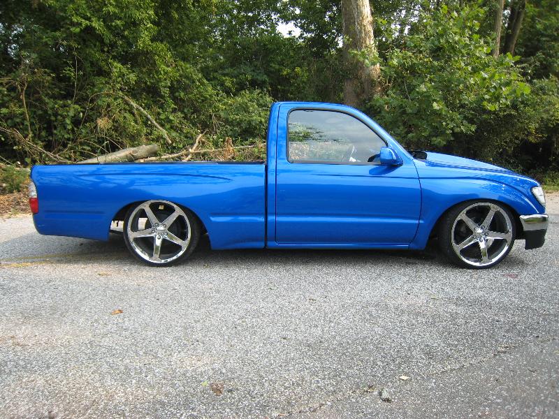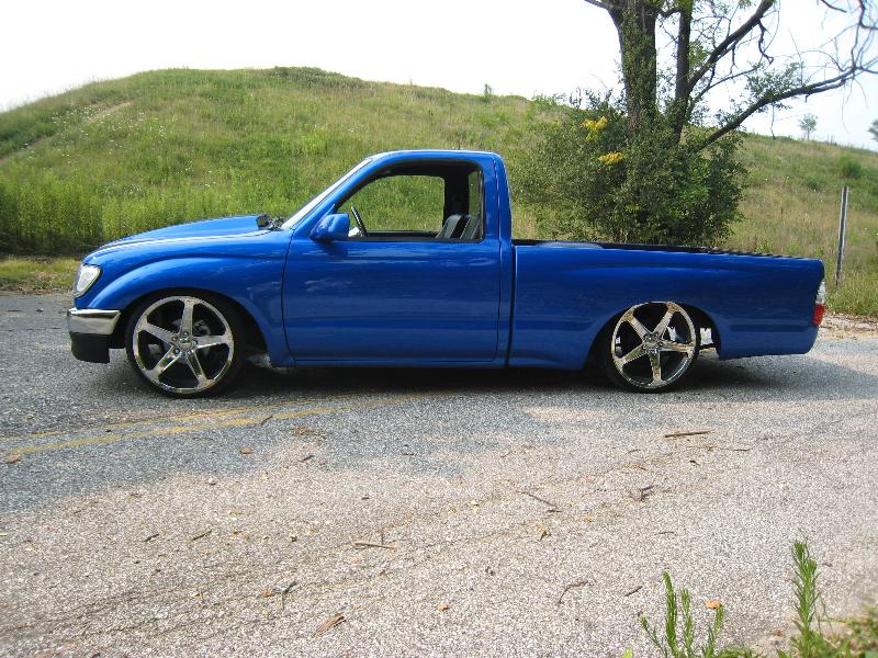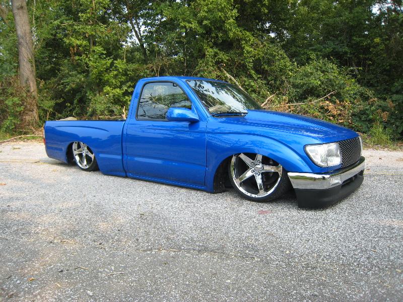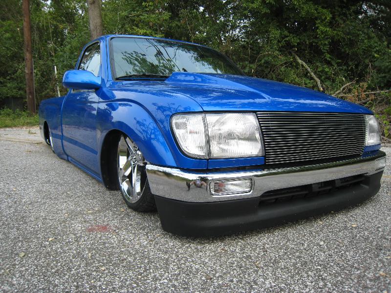 Body Dropped 4 inches, shaved door handles, tailgate handle and gas lid door, 97 Tacoma front bumper, clear corners and bumpers, red and white tail lights, welded in roll pan, cowl induction hood, House of Colors blue paint, billit grille and spray in Bed Liner.