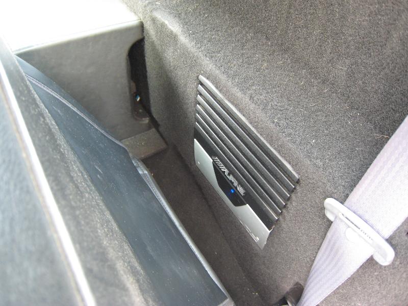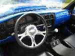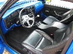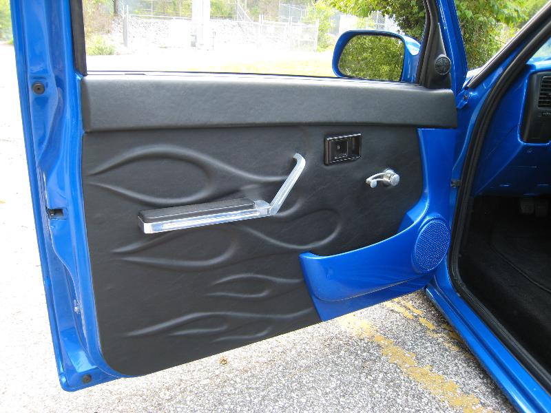 Black leather interior, 2001 Acura Integra Leather seats, flames on door panels and headliner, custom built center console with 8" JL Audio sub on back side of console speaker box, 2 alpine amps behind each seat, painted dash to match truck, Billet Specialties polished steering wheel and a Alpine CD player.