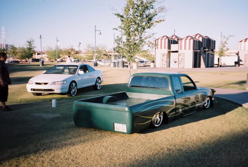 shaved door handles, mirrors, front turn signals, tailgate, tailgate handle, gas door, rocker panels molded together, firewall, third brake light (hump cut out of roof and smoothed back in), smooth bed floor, smooth door jams, tailights (replaced w/ 10" LEDs), lines under rear window, suicide doors, primer and custom graphics (done by john owens & other members of perfect poise), body dropped 4 1/2", smooth bedsides, tubbed(FOR SALE)