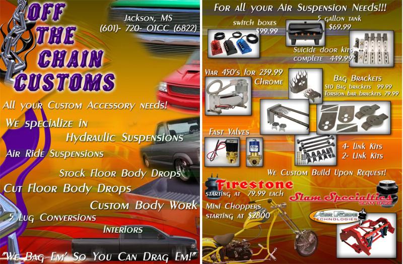 My name is Ben . I now own OTC customs ...Off the Chain Customs has relocated from Jackson MS we are now working in conjunction with Erratic Customs you can reach us at 985-515-0228..... We do everything from custom body work and paint to custom bag and hydraulics set up's, Stock floor and traditional body drops also. We also specialize in 5 lug conversions, narrowing rearends and cross drilling rotors. If it's custom we can do it. Give us a call at(985)515-0228 or drop us an Email me at SSMLaynbdy@yahoo.com for more information.
