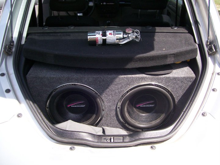 2 Audiobahn 12's, Rockford Power series amp, 2 Diamond Audio highs and Pioneer head unit