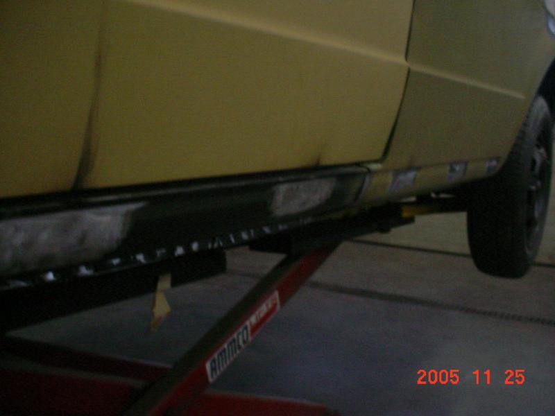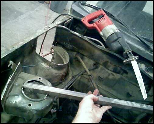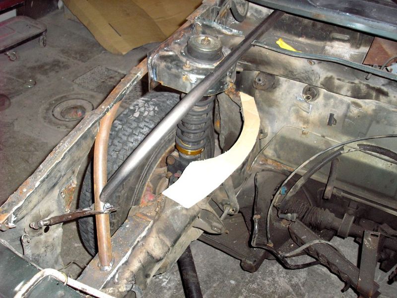 Cut/raised strut towers replaced with tube. Will run air struts (but don't have them yet) Rear axle will be narrowed, stub axles raised, and linked to lay on the rear. probably run behind and below the axle bags