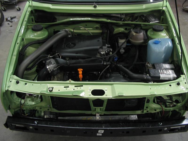 T3/T4 turbo, big ass blowoff, green series intake cones, custom built (by me) intercooler pipes, huge frontmount intercooler, custom made cover for motor taken from new Jetta(cut by me) painted engine compartment. 2003 VW Jetta 1.8T motor. AEM boost guage, fuel pressure reglulator