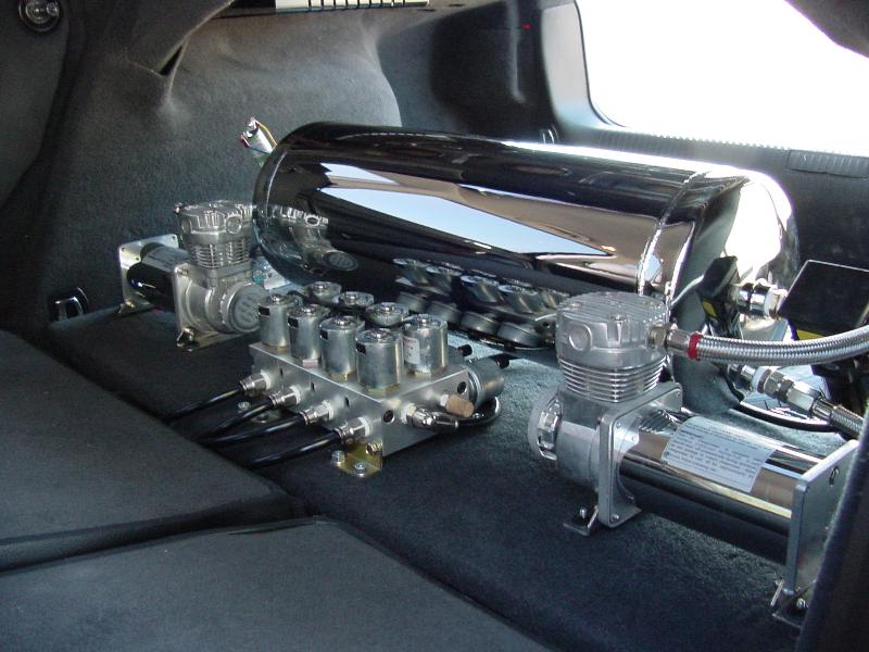 ASCO Valves (manifold), easy street strut bags with custom fab. upper and lower mounts, 2500 pound firestone bags in the rear, 2 VIAIR 420c compressors. One 5 gal chrome tank.