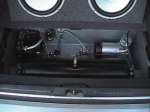Clifford alarm w/ remote windows, Spare tire compartment removed and replaced with a custom built box for air components, painted center console & air vents to match exterior color.